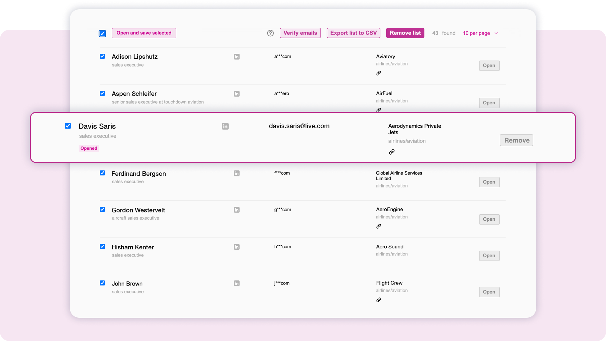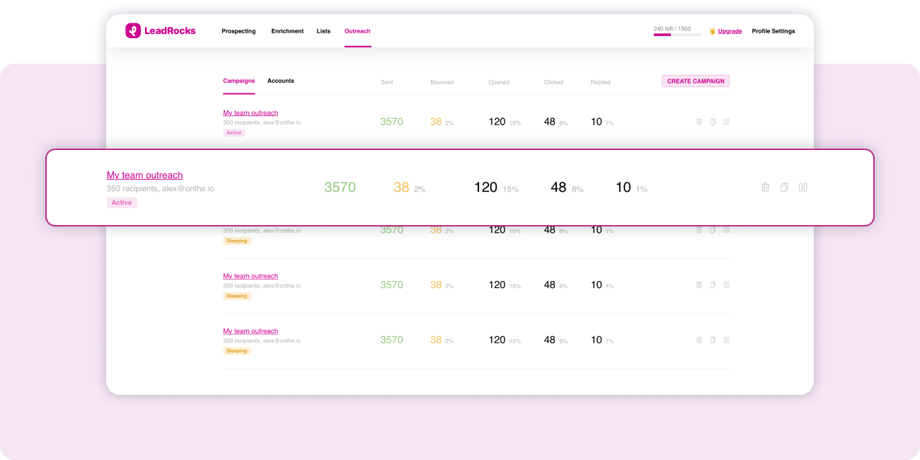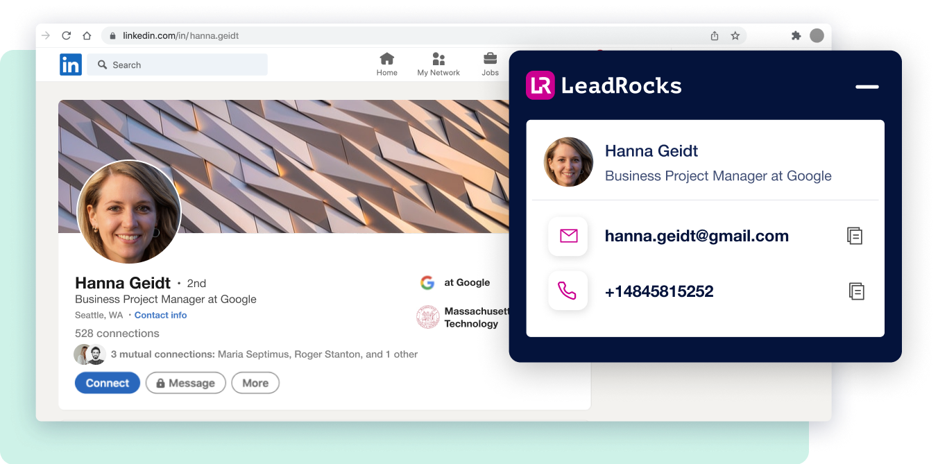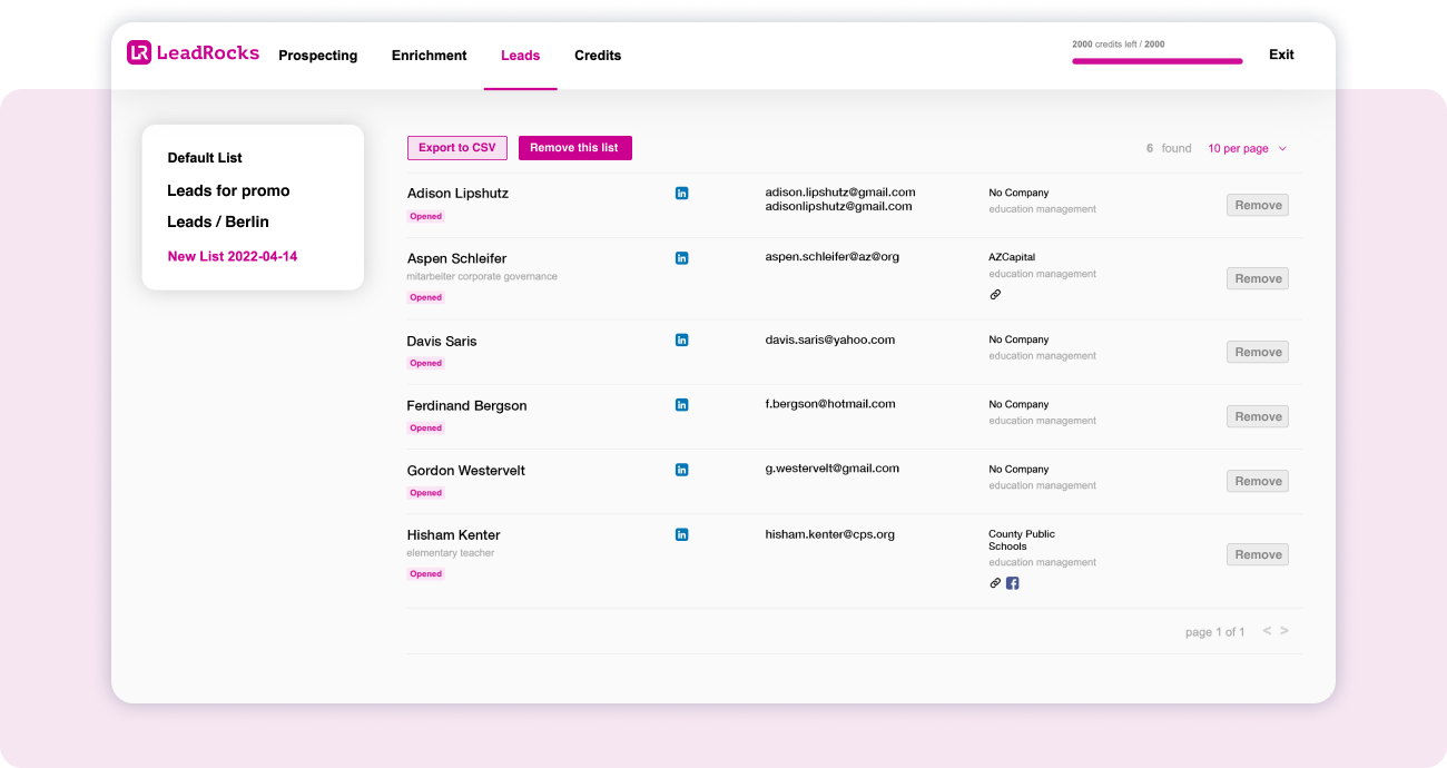 LeadRocks saves a bunch of our time! It lets you grab together the profiles you found, in one file, 1000 at a time. It speeds up the whole leadgen process for us. It helps a lot to find work emails and extend existing bases.