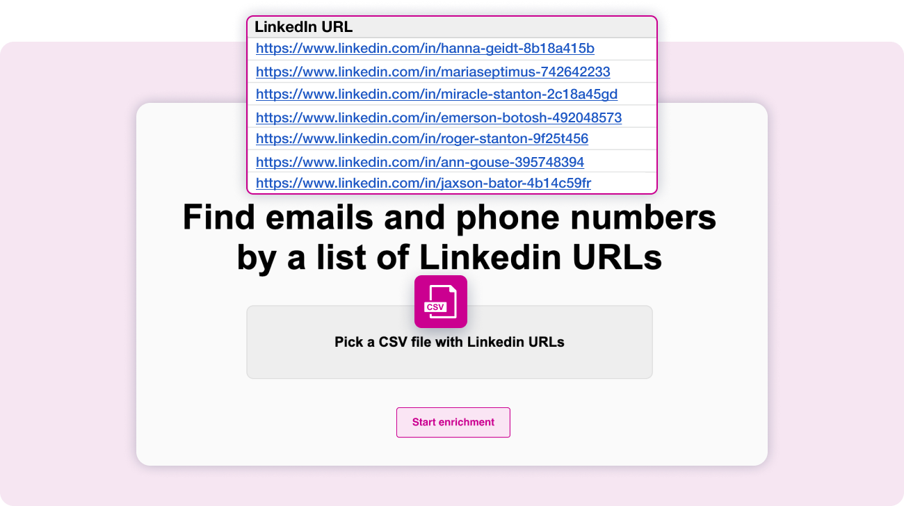 Data enrichments refers to the process of having your existing database completed with other data about your prospects. For example, you may have the list of prospect emails and search for their LI profiles or vice versa. In this case, a data enrichment tool is what can help you enrich your base: the only thing you need to do is to upload that list of emails and choose the right tool that is going to crawl all existing databases and add LI profiles next to each email that it was able to find profiles for.